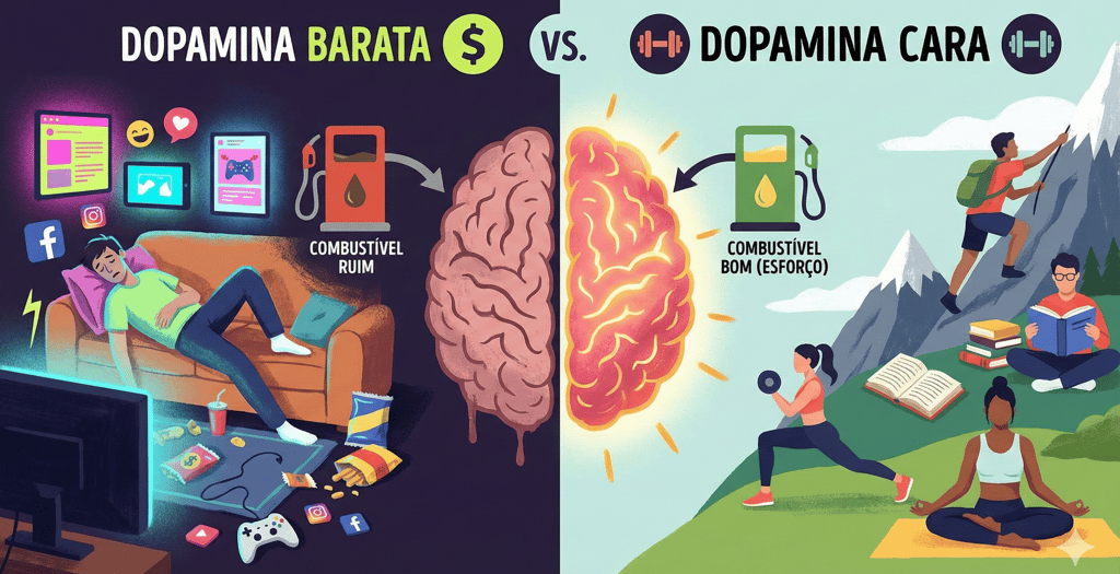 A dopamina barata (ou "ruim") é aquela obtida com pouco ou nenhum esforço. Ela vem do scroll infinito no TikTok, da notificação do Instagram, da pornografia, dos videogames e dos alimentos ultraprocessados. O cérebro humano evoluiu em um ambiente de escassez, onde recompensas (comida, sexo, novidade) eram difíceis de conseguir. Quando você oferece ao seu cérebro uma fonte de prazer instantâneo e sem custo energético, ele entende que encontrou uma "mina de ouro" biológica.